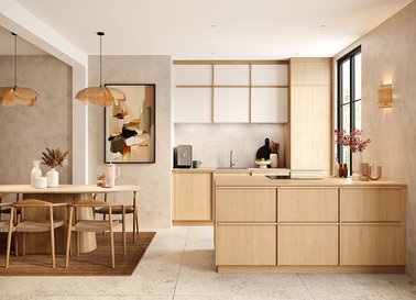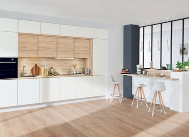 Vous cherchez une cuisine intemporelle aux lignes pures et sophistiquées ? Un modèle alliant naturellement le blanc avec le bois vous séduira.